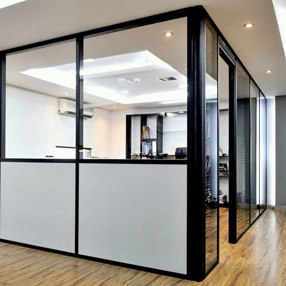 - Учитывайте назначение помещения: для переговорных и кабинетов руководителей лучше подходят стеклянные или алюминиевые перегородки, для рабочих зон — комбинированные ДСП или гипсокартон.