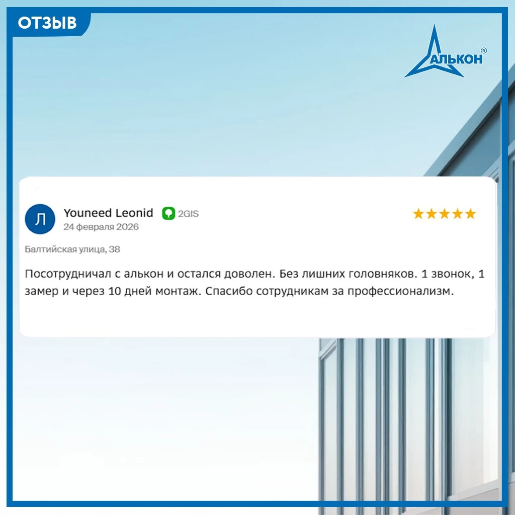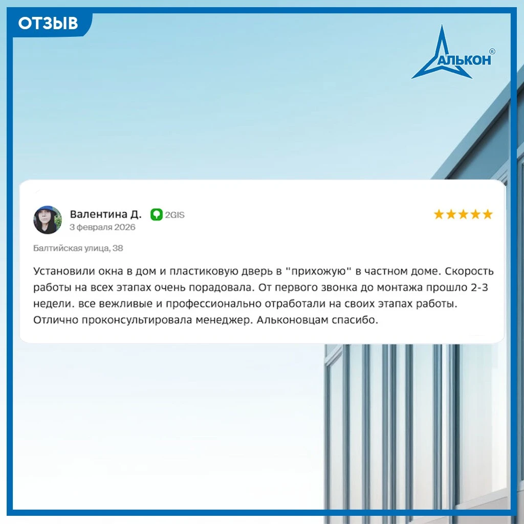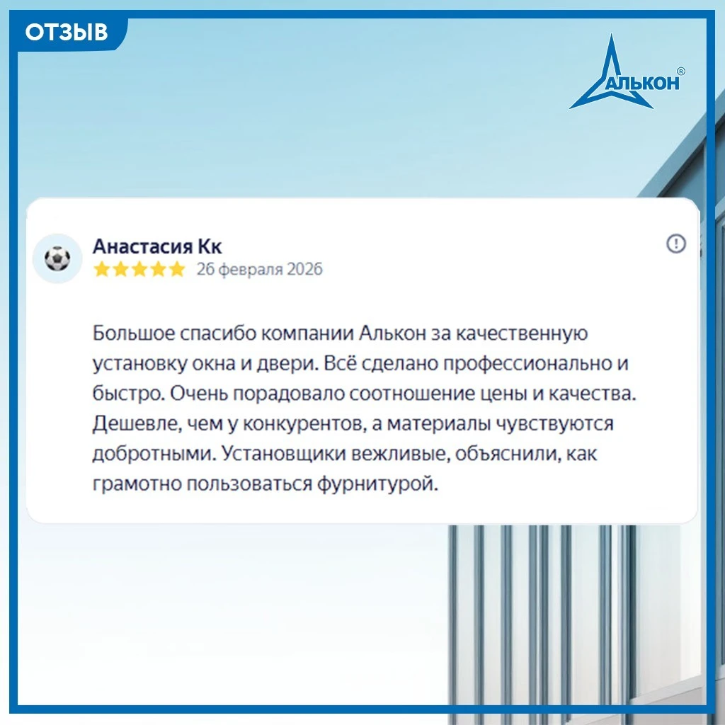 Большое спасибо компании Алькон за качественную установку окна и двери. Всё сделано профессионально и быстро. Очень порадовало соотношение цены и качества. Дешевле, чем у конкурентов, а материалы чувствуются добротными. Установщики вежливые, объяснили, как грамотно пользоваться фурнитурой.
